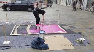 Sigurd Roscher wurde beauftragt sich eine Bodengestaltung für den Bereich Neupfarrplatz / Eingang Wahlenstraße in Regensburg zu überlegen und umzusetzen. Die Wahlenstraße wird bis Ende 2019 umgebaut und ist derzeit nicht unbedingt einladend. Um die Passanten dennoch in die Straße und deren Geschäfte zu locken, konzipierte er auf dem provisorischen Teerstreifen eine grafische Lösung. Angelehnt an einen Zebrastreifen sind Pfeile in Richtung Baustellenstraße aufgetragen. Für größtmöglichen Kontrast sorgt die Farbe namens Bikini-Pink. Um eine Telefongesellschafts-Konnotation zu vermeiden, sind weiße grafische Gestaltungselemente hinzugefügt. Da einige Streifengruppen von Passanten sofort mit einem großen deutschen Sportartikelhersteller in Verbindung gebracht wurden, musste er diese mit zusätzlichen Strichen versehen, um nicht eine falsche Assoziation zu erzeugen. Laut der Kommentare und dem Feedback der Passanten am Tag der Erstellung funktionert der Streifen als Wachrüttler und Wegweiser. Die mehrdeutige Textzeile „Alles Offen“ wird von den meisten Fußgängern auf die Läden bezogen und erfüllt somit seinen Zweck. Die Malaktion musste an einem Sonntagvormittag stattfinden, da sonst der Verkehr durch Bus-, Liefer-, Baustellenfahrzeuge, Radfahrer und Fußgänger ein Bemalen der Straße an dieser Stelle unmöglich machen. Das Bild wird sich in seiner kurzen Lebensdauer von ca. 2 Monaten durch die Belastung stark verändern bis es dann endgültig durch eine neue Wahlenstraße ersetzt wird.